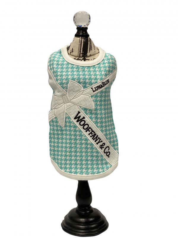 Camiseta sin mangas con dibujo de pata de gallo en colores blancos y tiffany y gran lazada en blanco bordada.